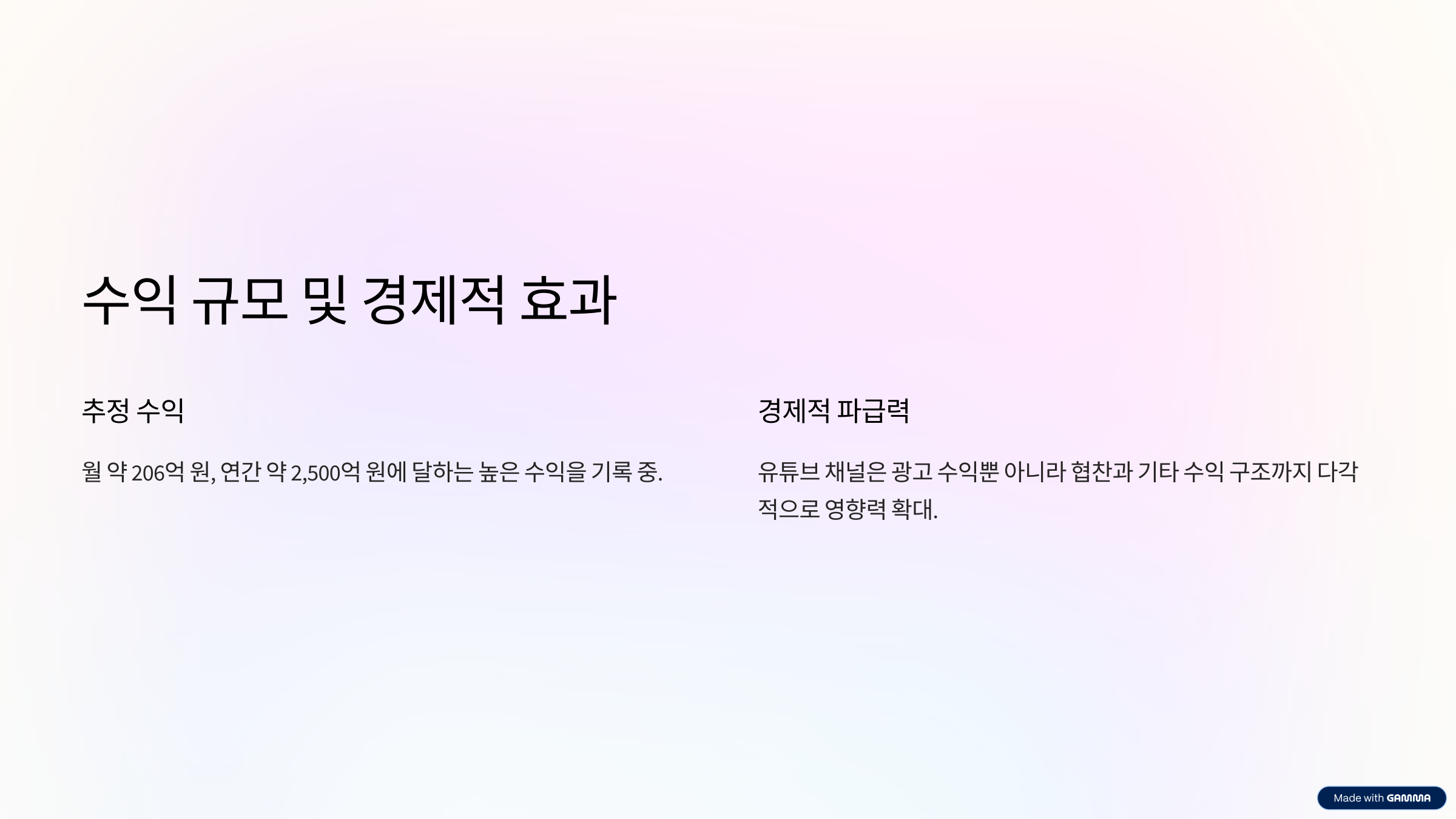 김프로 채널의 월 수익은 약 206억 원, 연 수익은 약 2,500억 원으로 추정된다. 이는 유튜브 광고 수익 외에도 콘텐츠 활용도, 브랜드 콜라보, 굿즈 등 다양한 수익 구조 덕분이다.