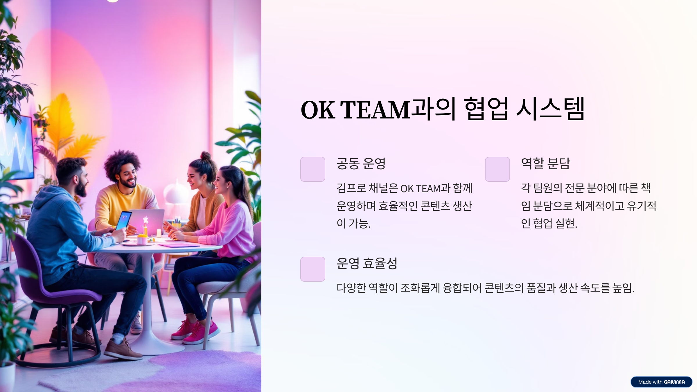 김프로 채널은 김동준, 유백합, 그리고 2023년부터 합류한 유하영, 정희림으로 구성된 OK TEAM이 함께 운영하고 있다. 이들은 팀워크와 빠른 제작 속도를 바탕으로 숏폼 콘텐츠의 정점을 찍으며, 유튜브 알고리즘을 완벽히 공략하고 있다.