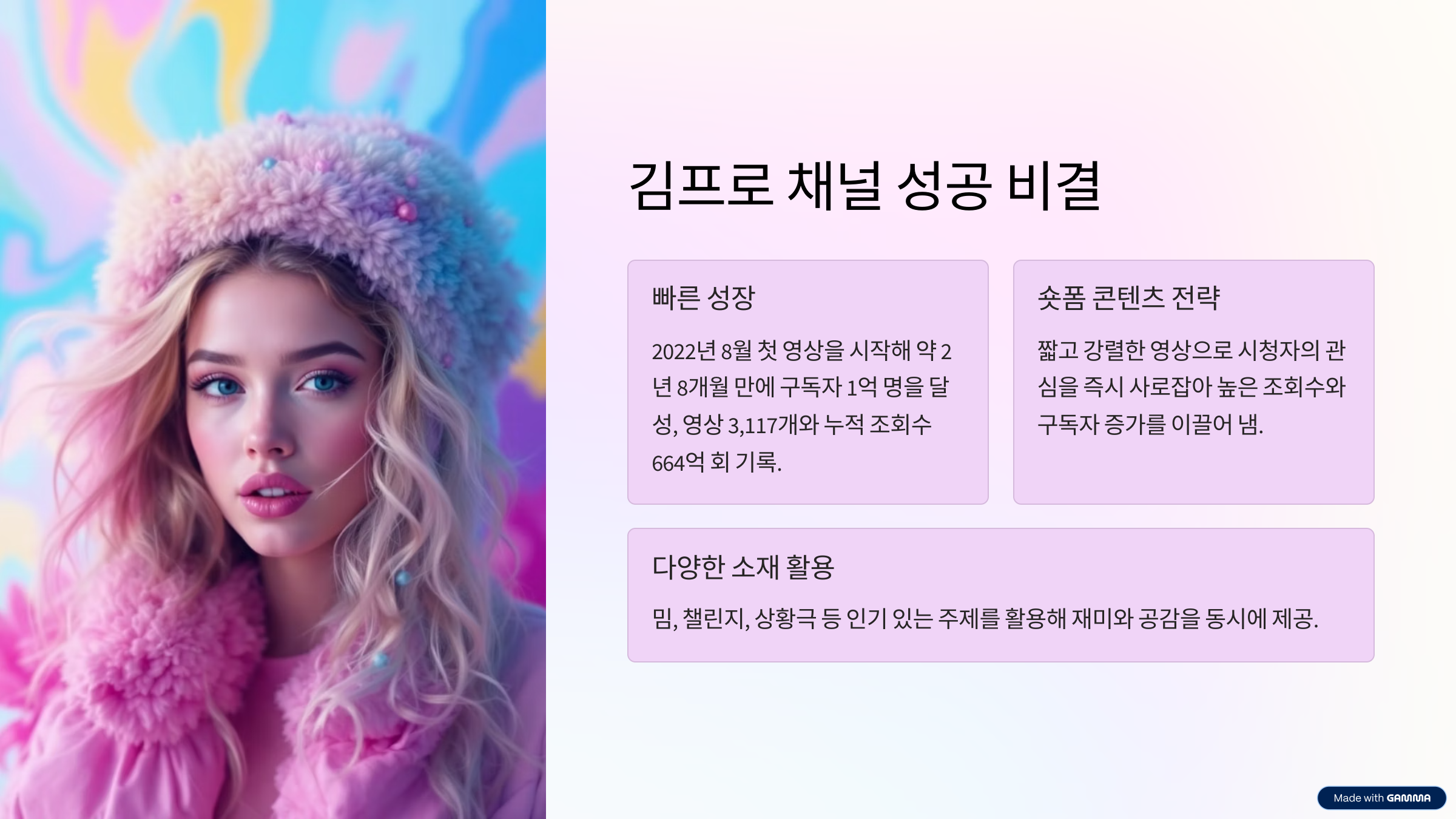 김프로 채널은 밈(Meme), 챌린지, 상황극 중심의 1분 미만 숏폼 콘텐츠로 대중의 시선을 사로잡았다.