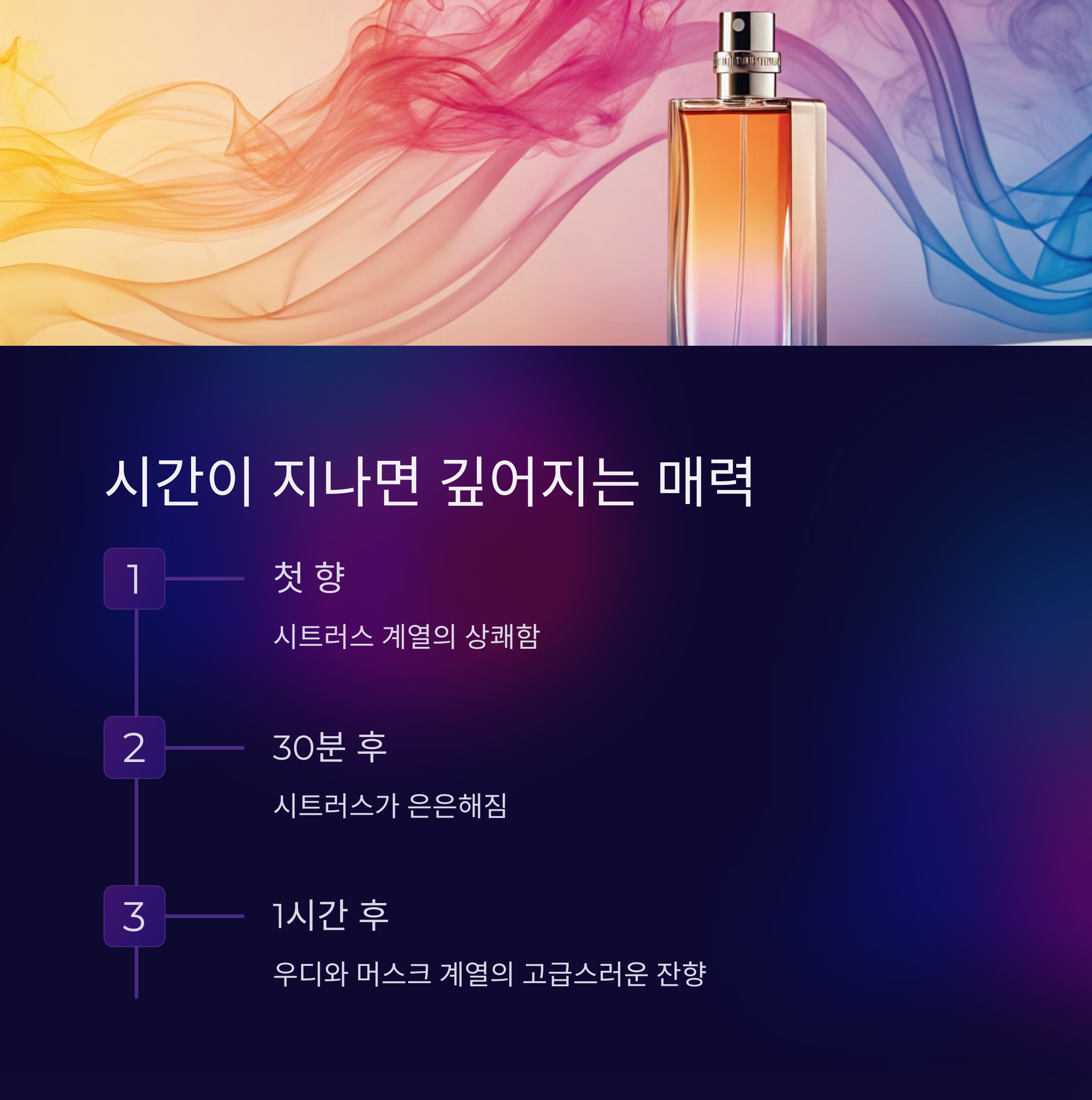 시트러스 계열이 은은해지고, 우디와 머스크 계열의 잔향이 피부에 자연스럽게 스며듭니다.