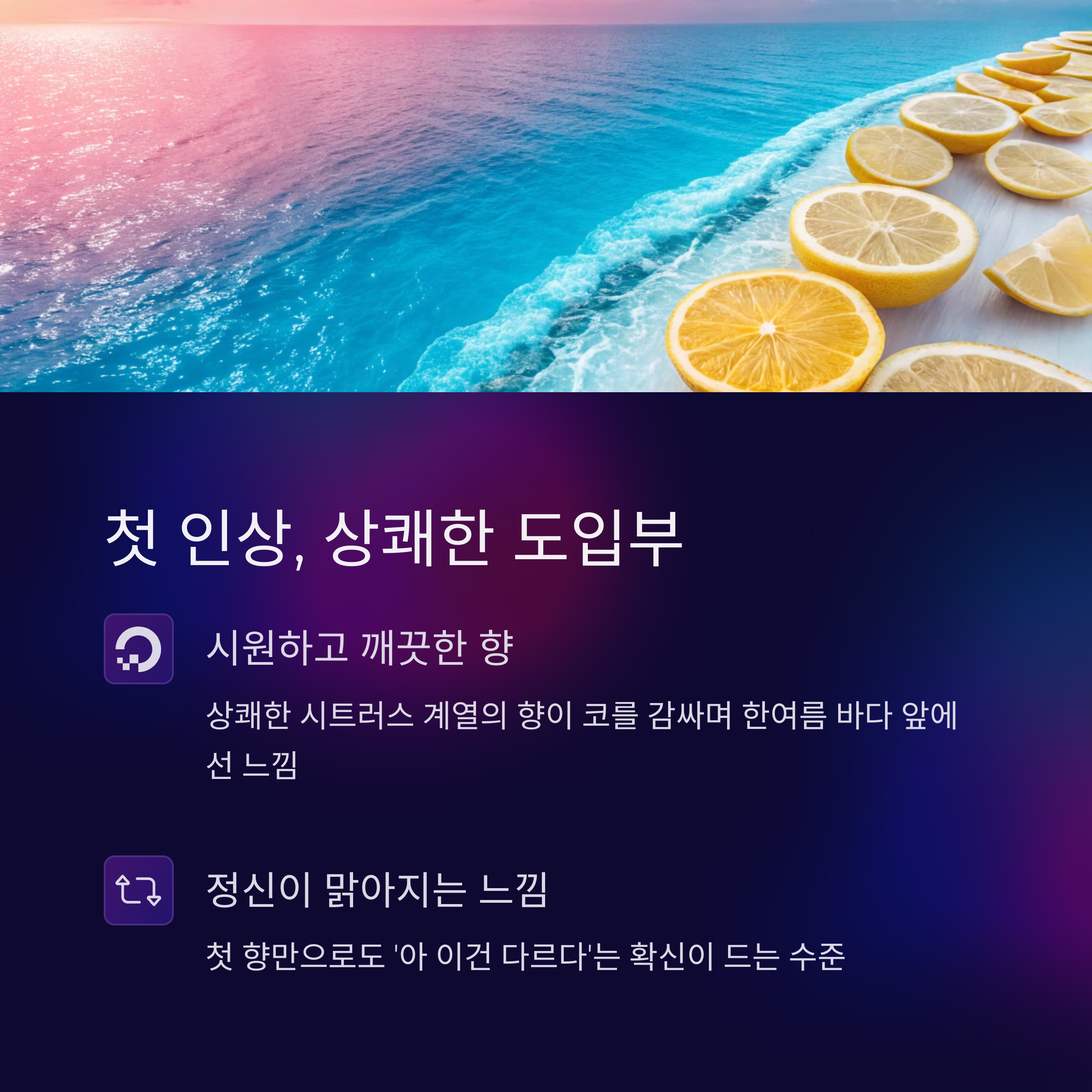 상쾌한 시트러스 계열의 향이 코를 감싸며, 한여름 바다 앞에 선 느낌을 줍니다.