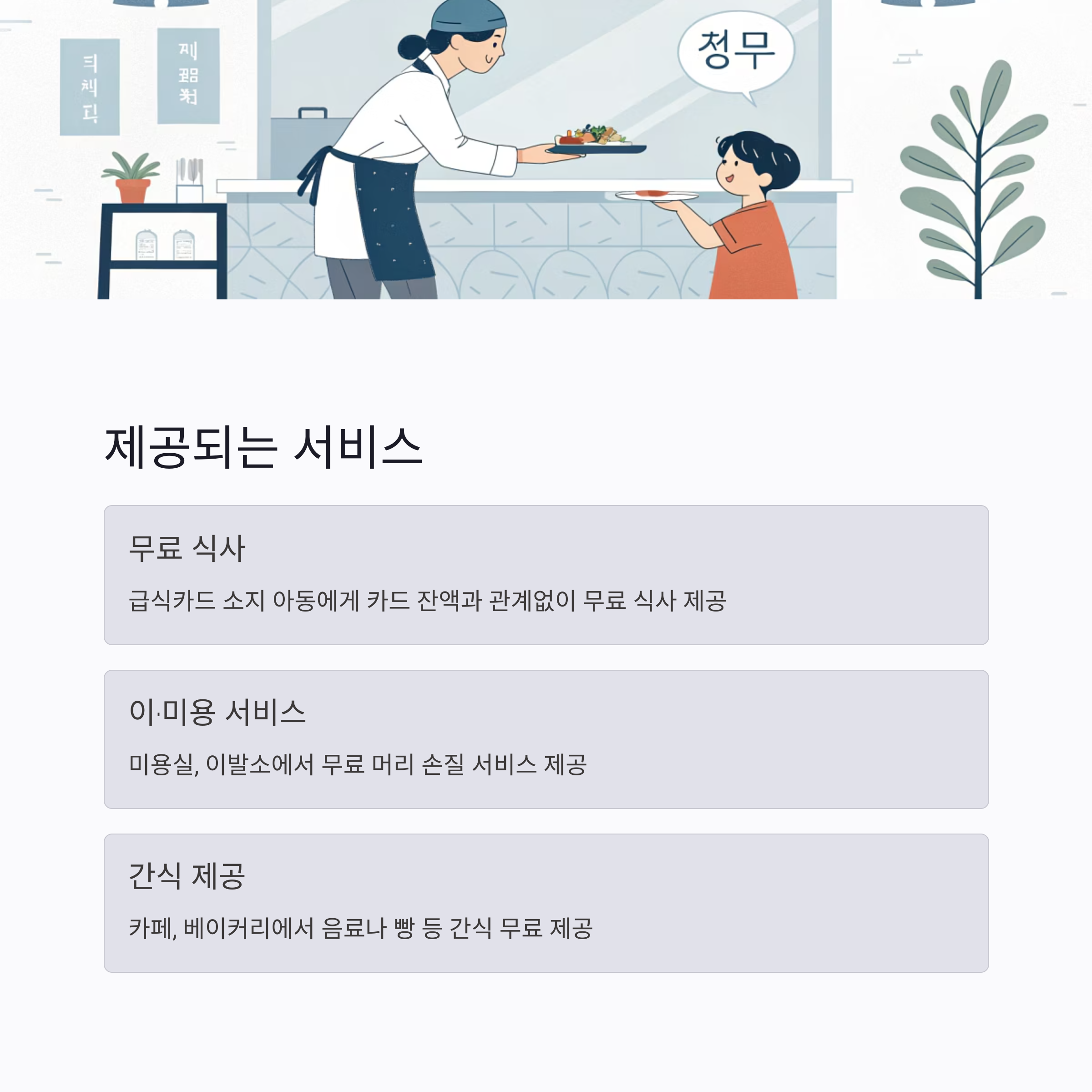 가장 대표적인 서비스로, 음식점에서 급식카드(지자체나 교육청에서 발급)를 소지한 아동·청소년에게 무료로 한 끼 식사를 제공합니다. 카드 잔액과 관계없이 편하게 식사할 수 있도록 배려합니다. - 이·미용 서비스