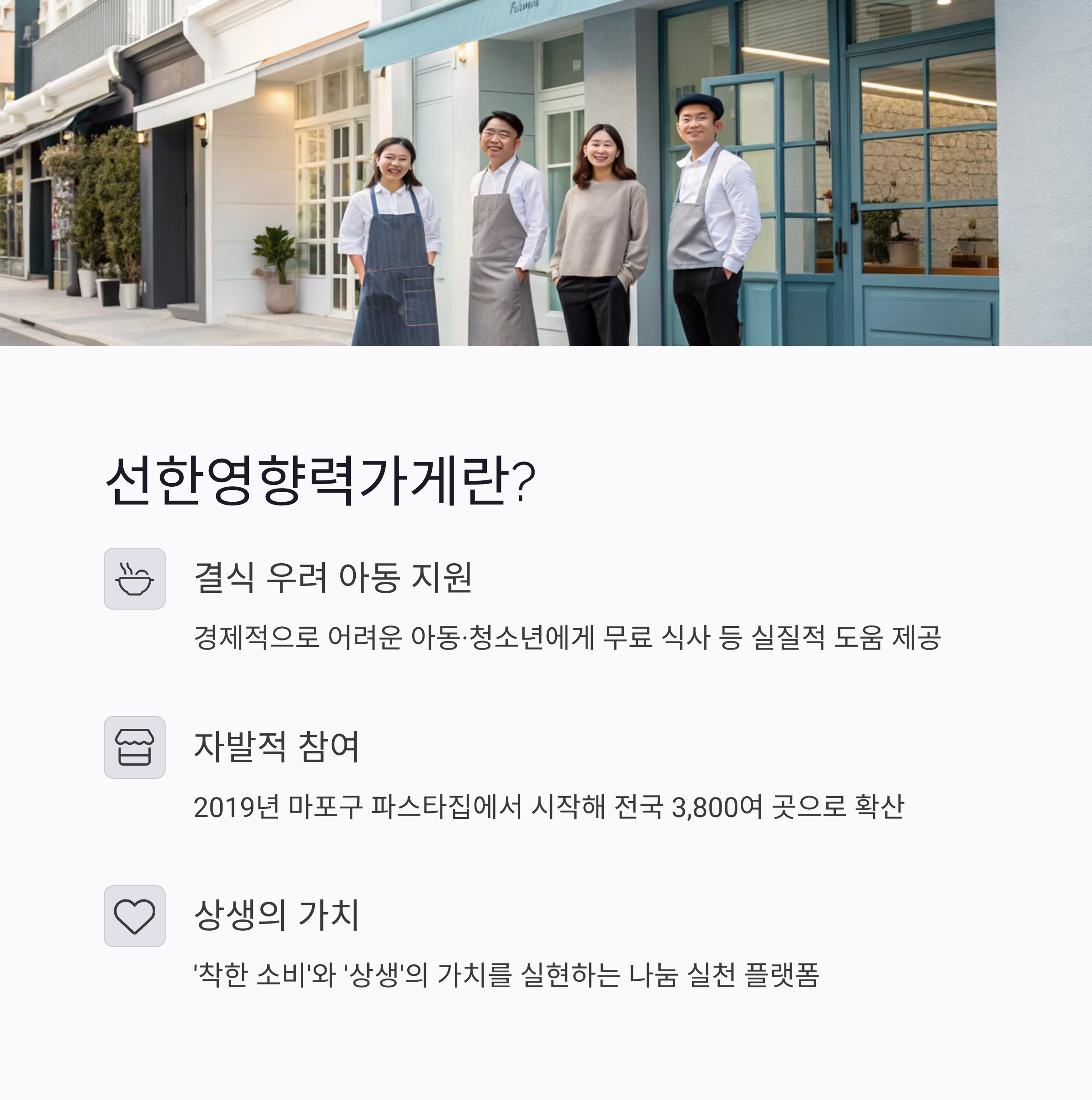 정리하면, 선한영향력가게는 지원을 받고 선정되는 것이 아니라, 선한 영향력을 나누고자 하는 가게가 스스로 신청해 참여하는 시민 주도의 나눔 네트워크입니다.