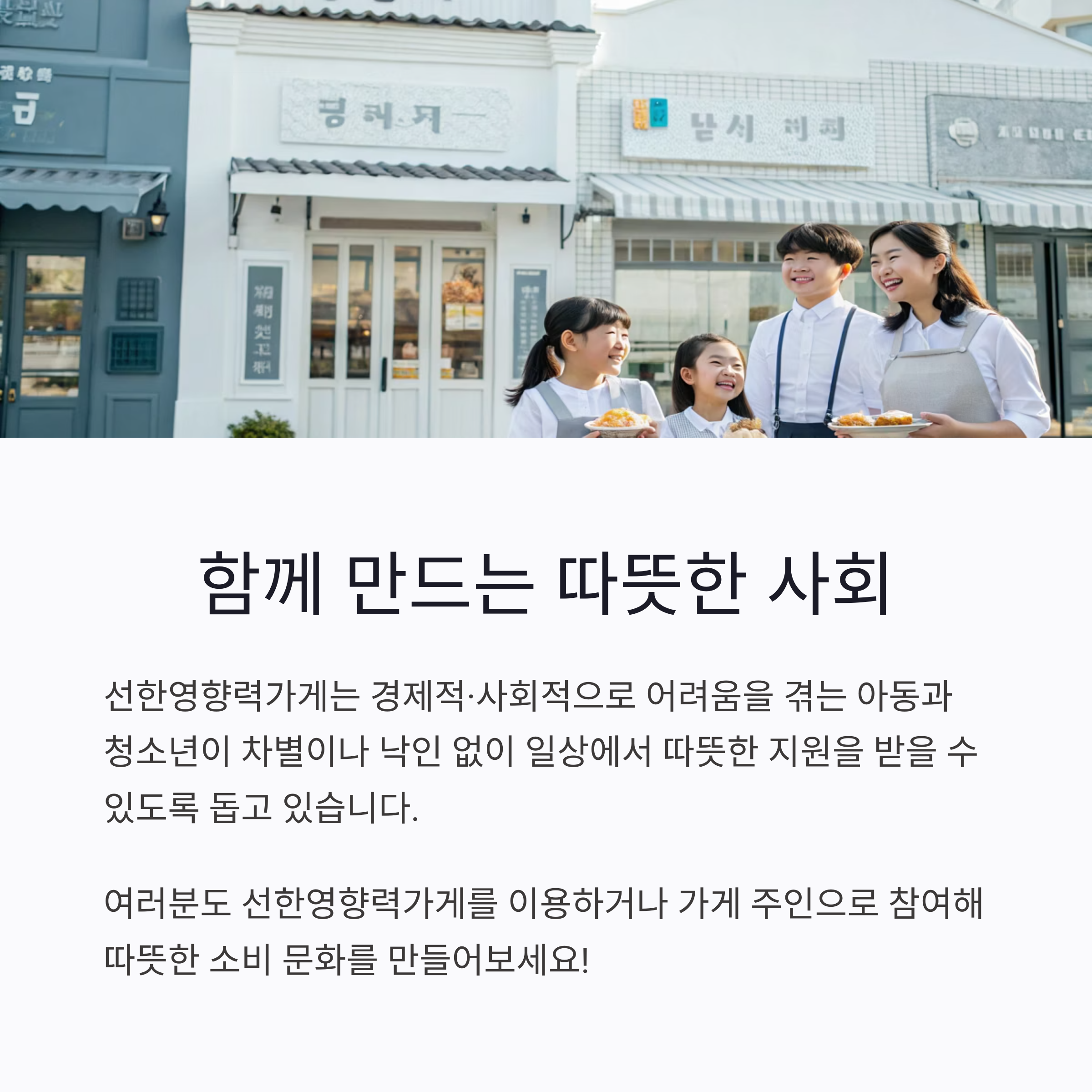 즉, 선한영향력가게는 경제적·사회적으로 어려움을 겪는 아동과 청소년이 차별이나 낙인 없이 일상에서 따뜻한 지원을 받을 수 있도록 돕는 역할을 하고 있습니다