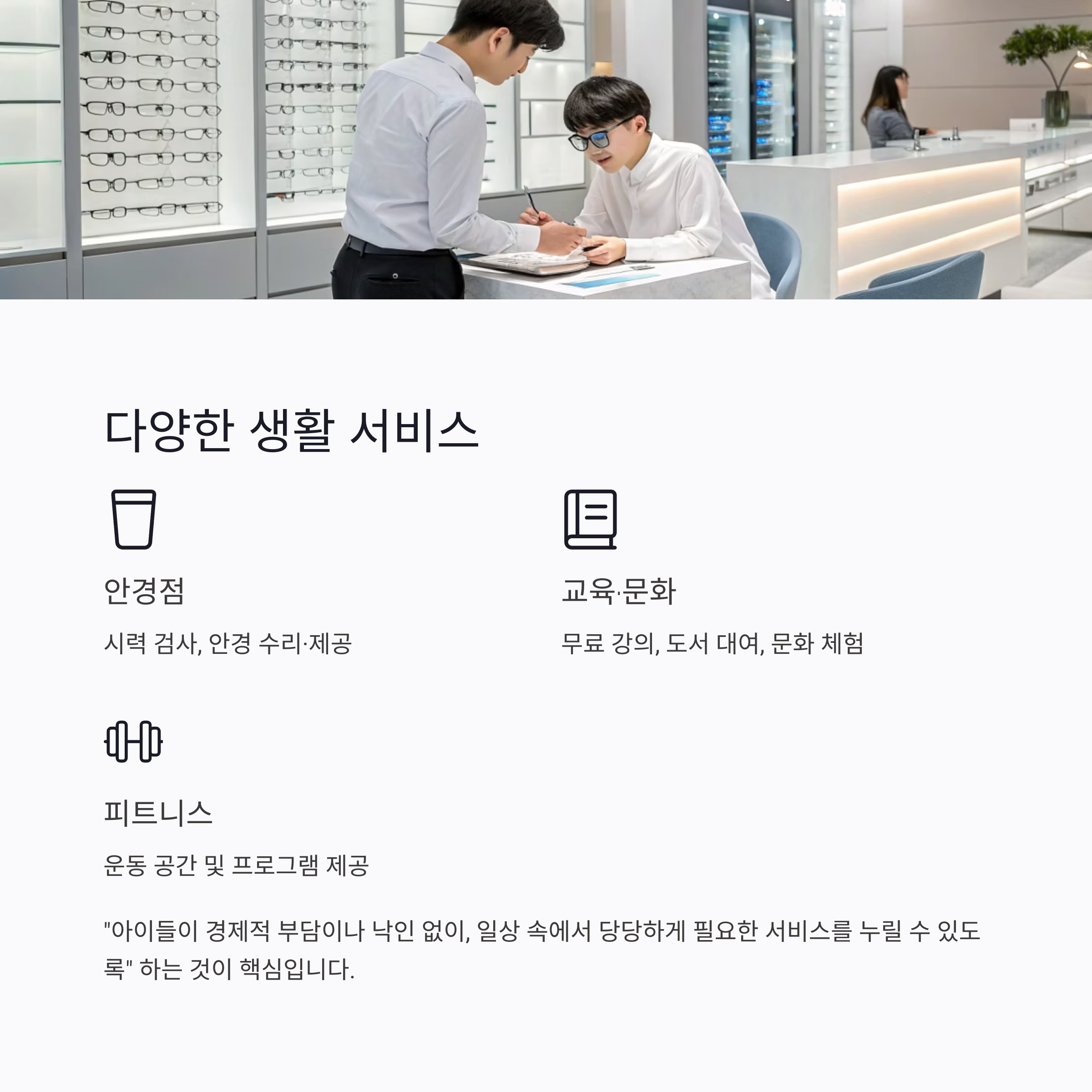 안경점에서는 시력 검사, 안경 수리·제공, 피트니스 센터에서는 운동 공간 제공, 법률상담 등 다양한 생활 밀착형 서비스도 일부 가게에서 지원하고 있습니다.