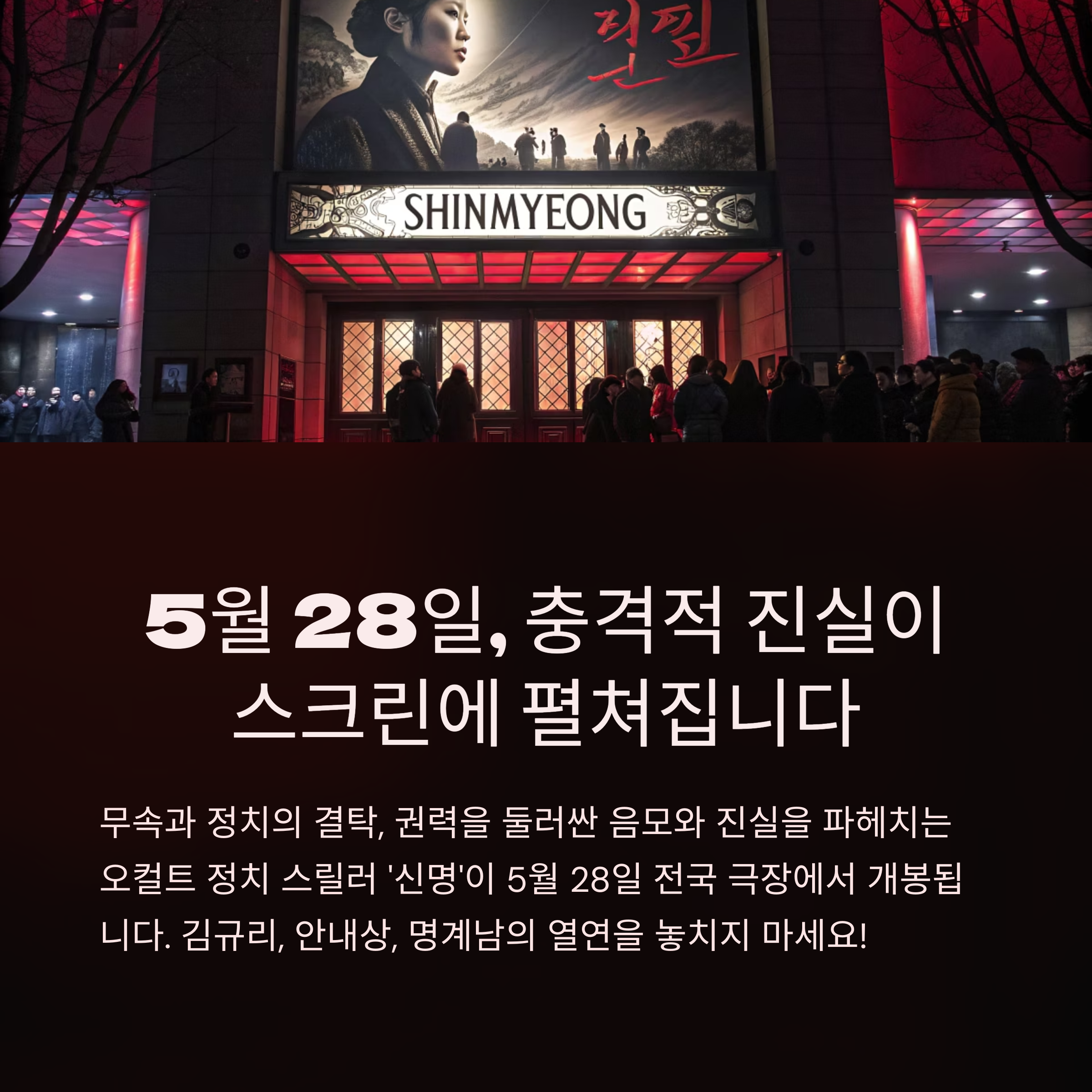 - 영화 '신명'은 무속과 정치의 결탁, 권력을 둘러싼 음모와 진실을 파헤치는 오컬트 정치 스릴러로, 김규리·안내상·명계남 등 배우들의 열연이 돋보이는 작품입니다.