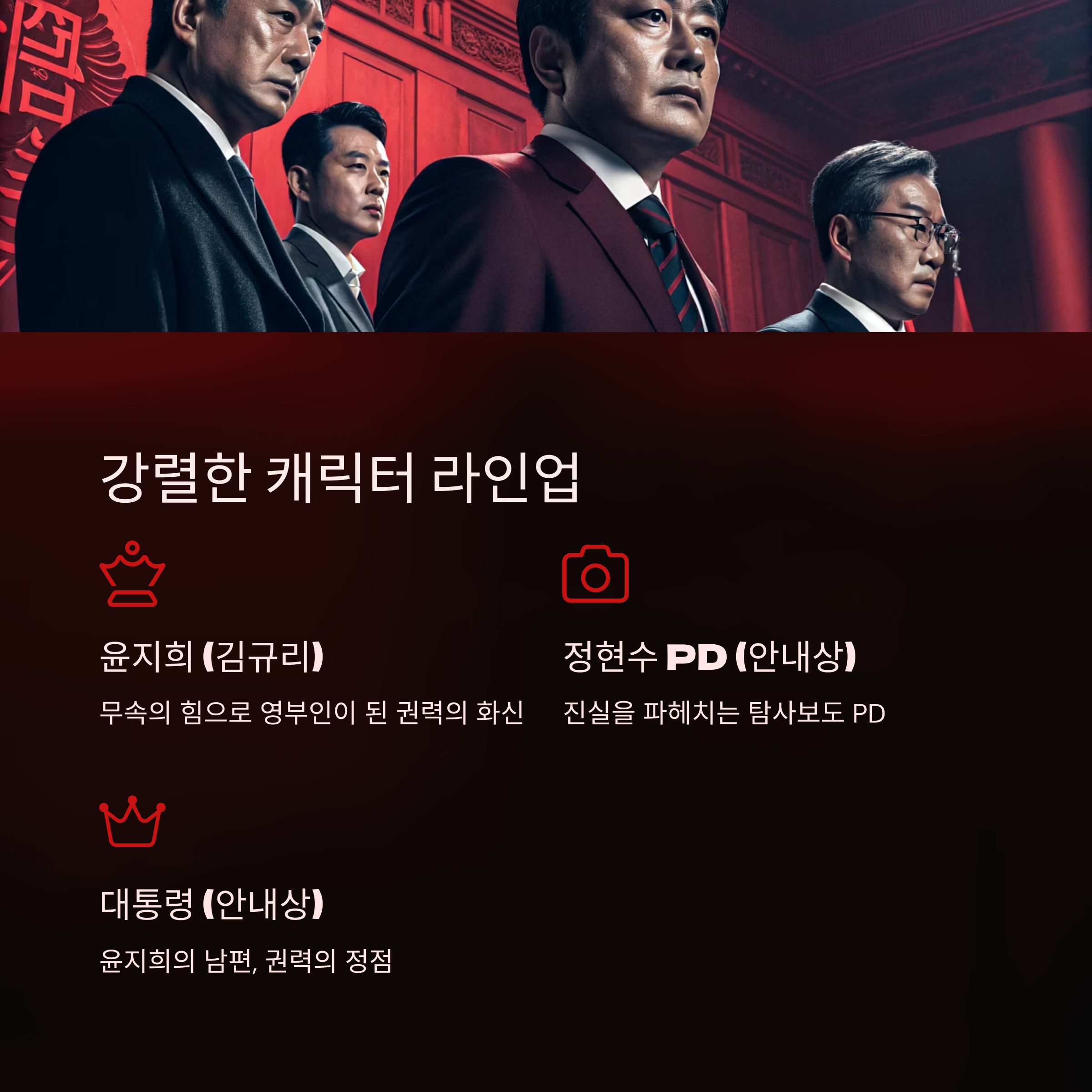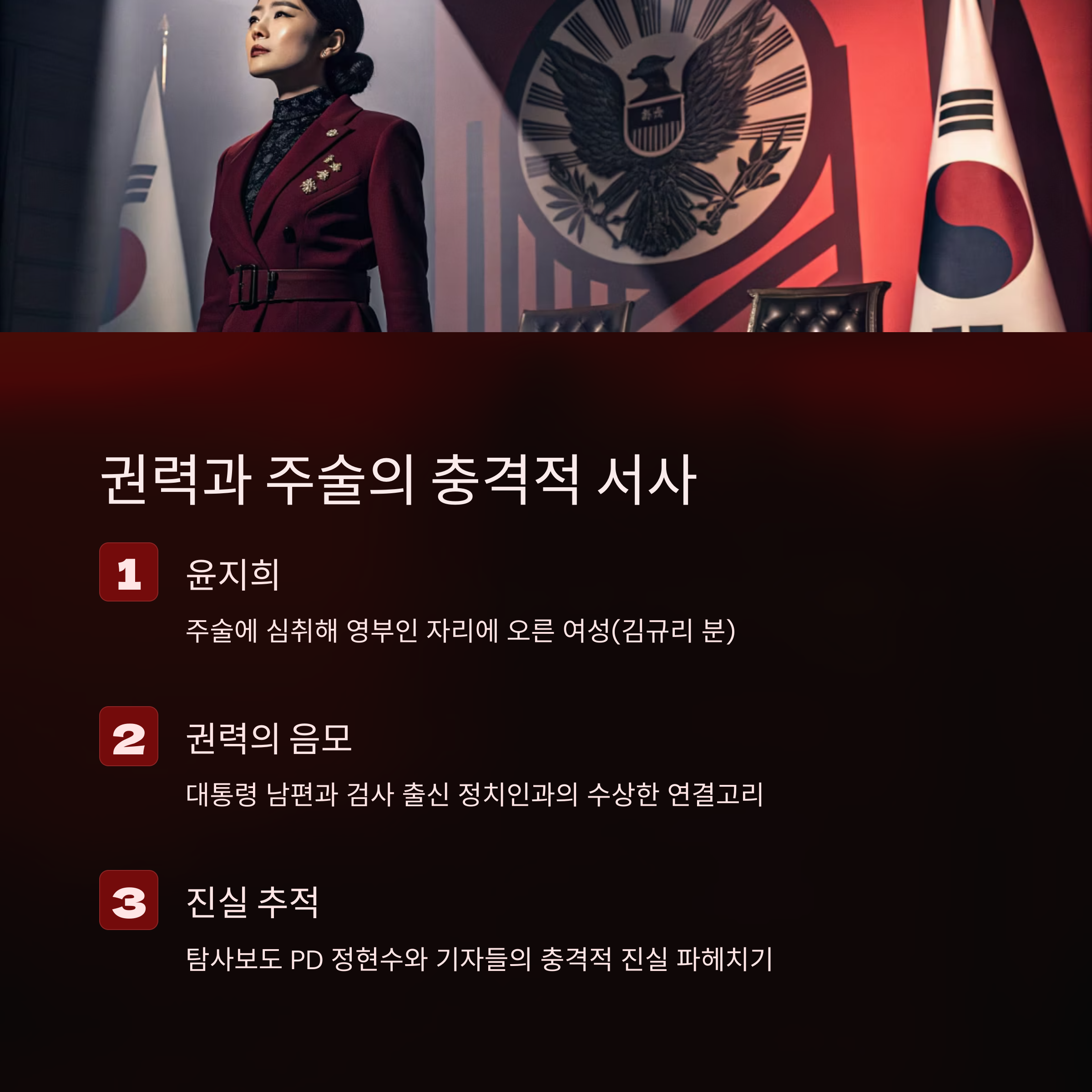 - 어린 시절부터 주술에 심취한 윤지희(김규리 분)는 성형, 신분·학력 위조 등으로 과거를 지우고, 신비로운 힘을 이용해 권력의 정점인 영부인 자리에 오릅니다.