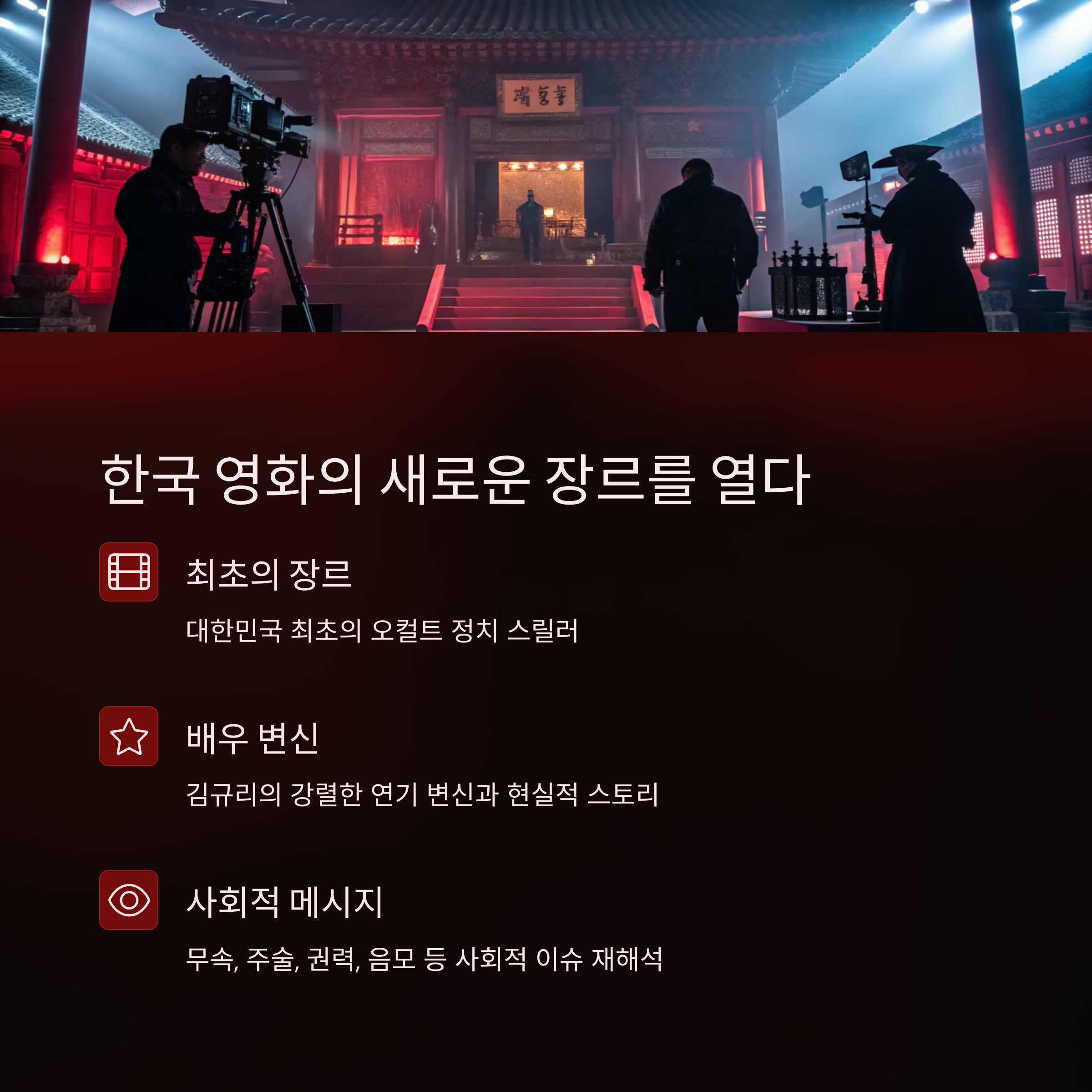 - 대한민국 최초의 오컬트 정치 스릴러 장르.