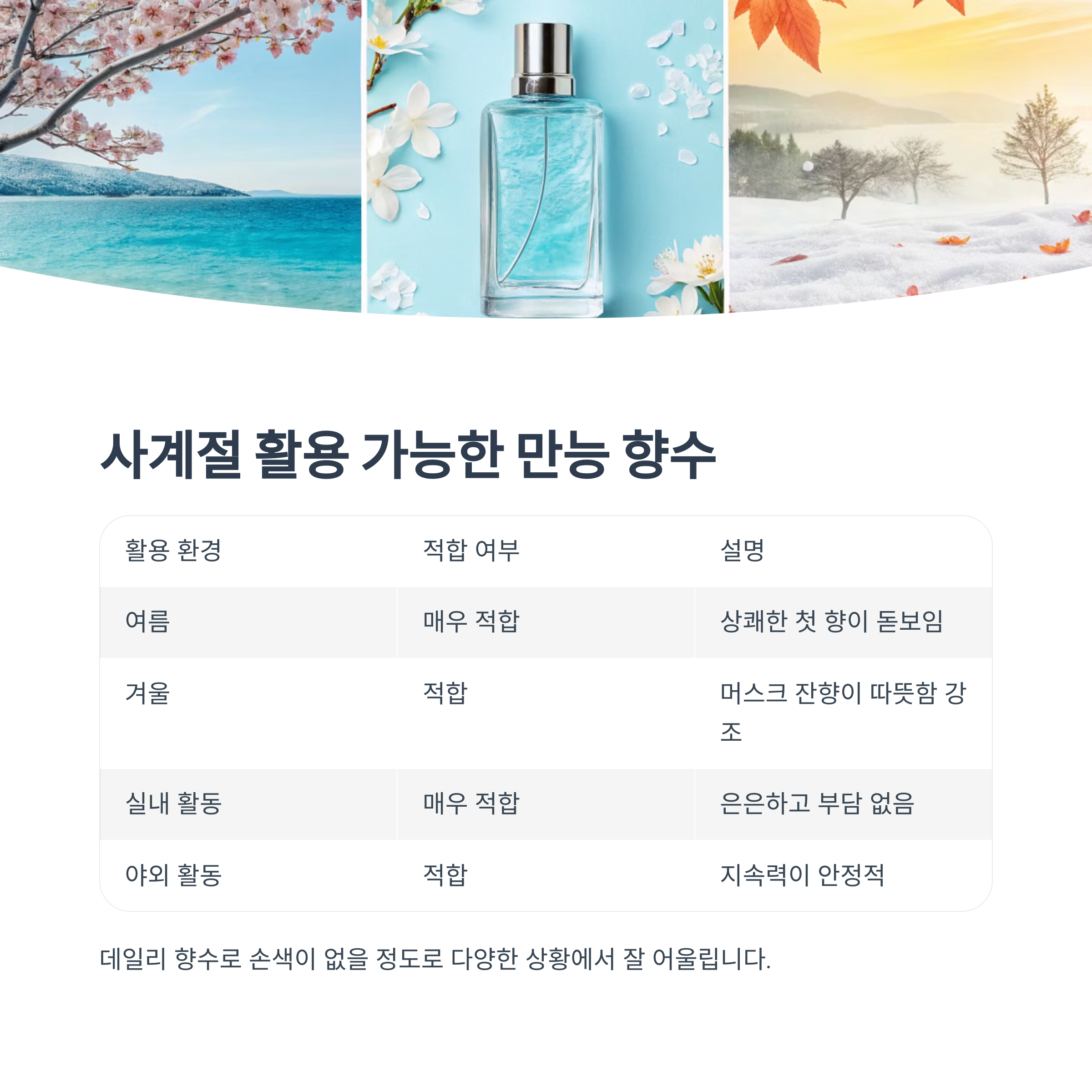 | 여름 | 매우 적합 | 상쾌한 첫 향이 돋보임 |