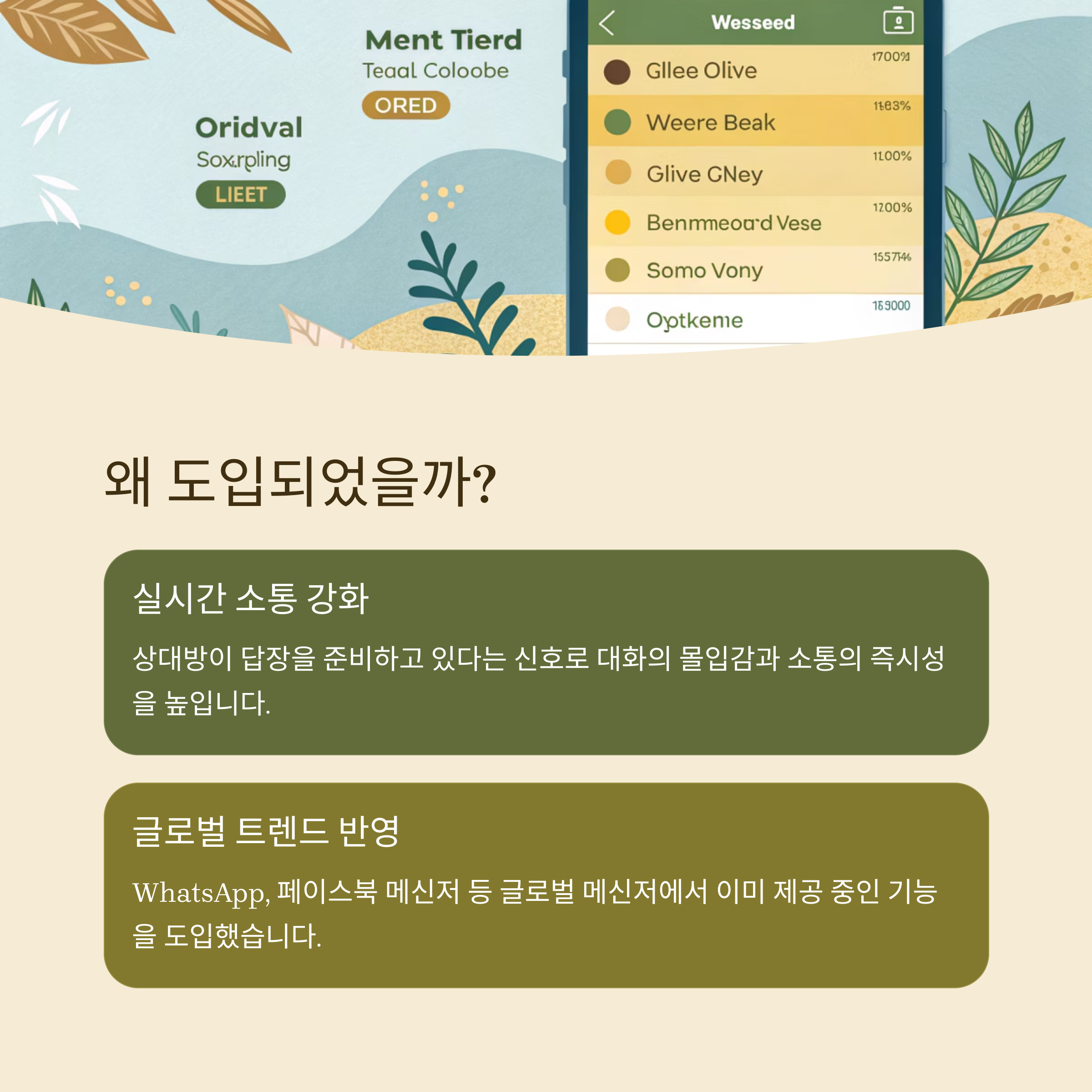 상대방이 답장을 준비하고 있다는 신호를 실시간으로 보여줌으로써, 대화의 몰입감과 소통의 즉시성을 높이기 위한 목적입니다. - 글로벌 트렌드 반영
