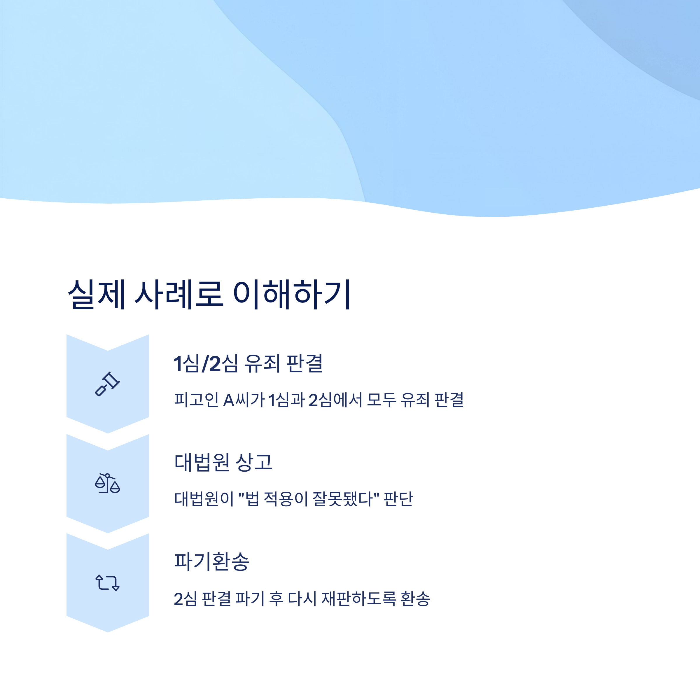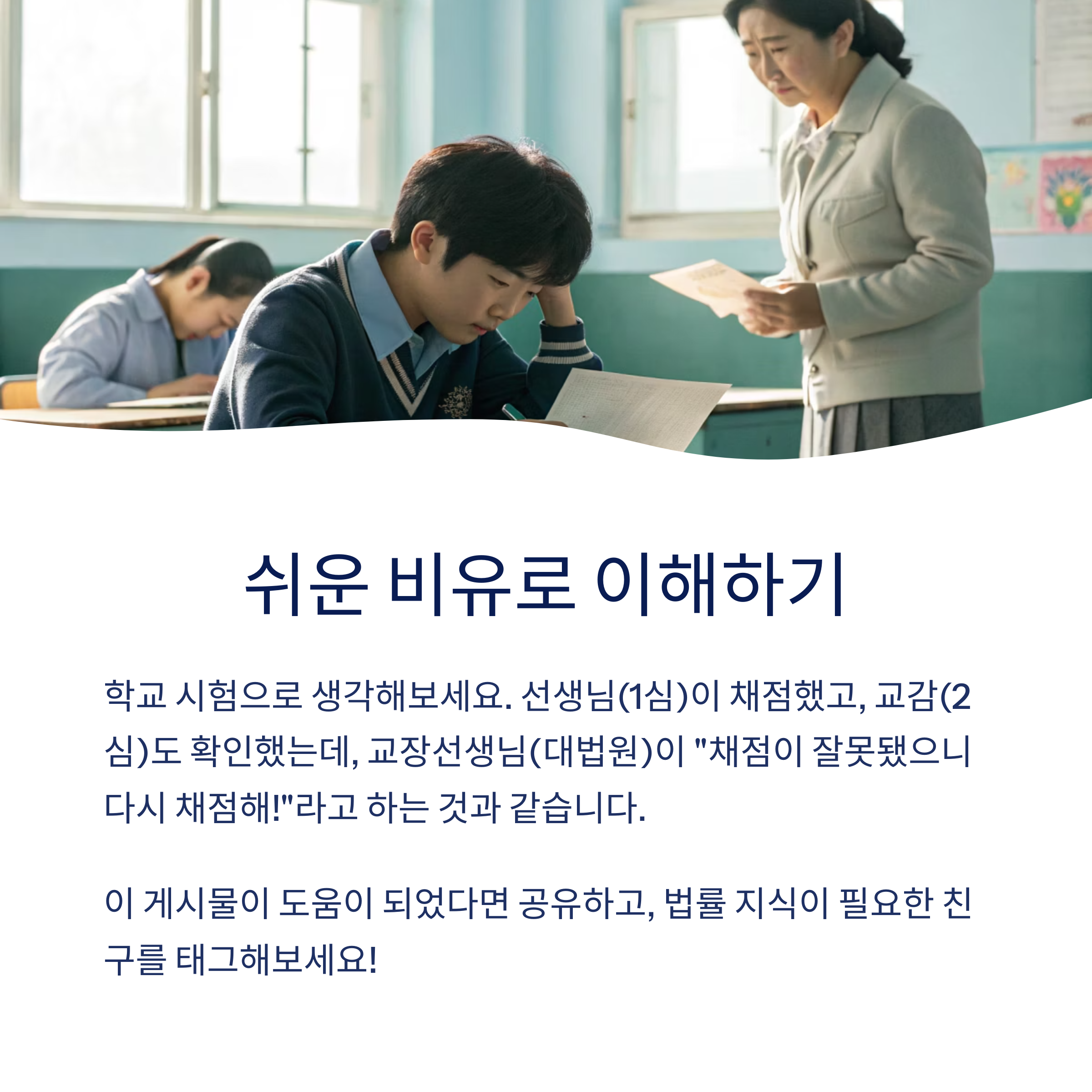 - 학교 시험에 비유하면, 1차 채점(1심), 2차 채점(2심)에서 점수가 나왔는데, 교장선생님(대법원)이 “채점이 잘못됐다, 다시 채점해!”라고 하는 것과 비슷합니다.