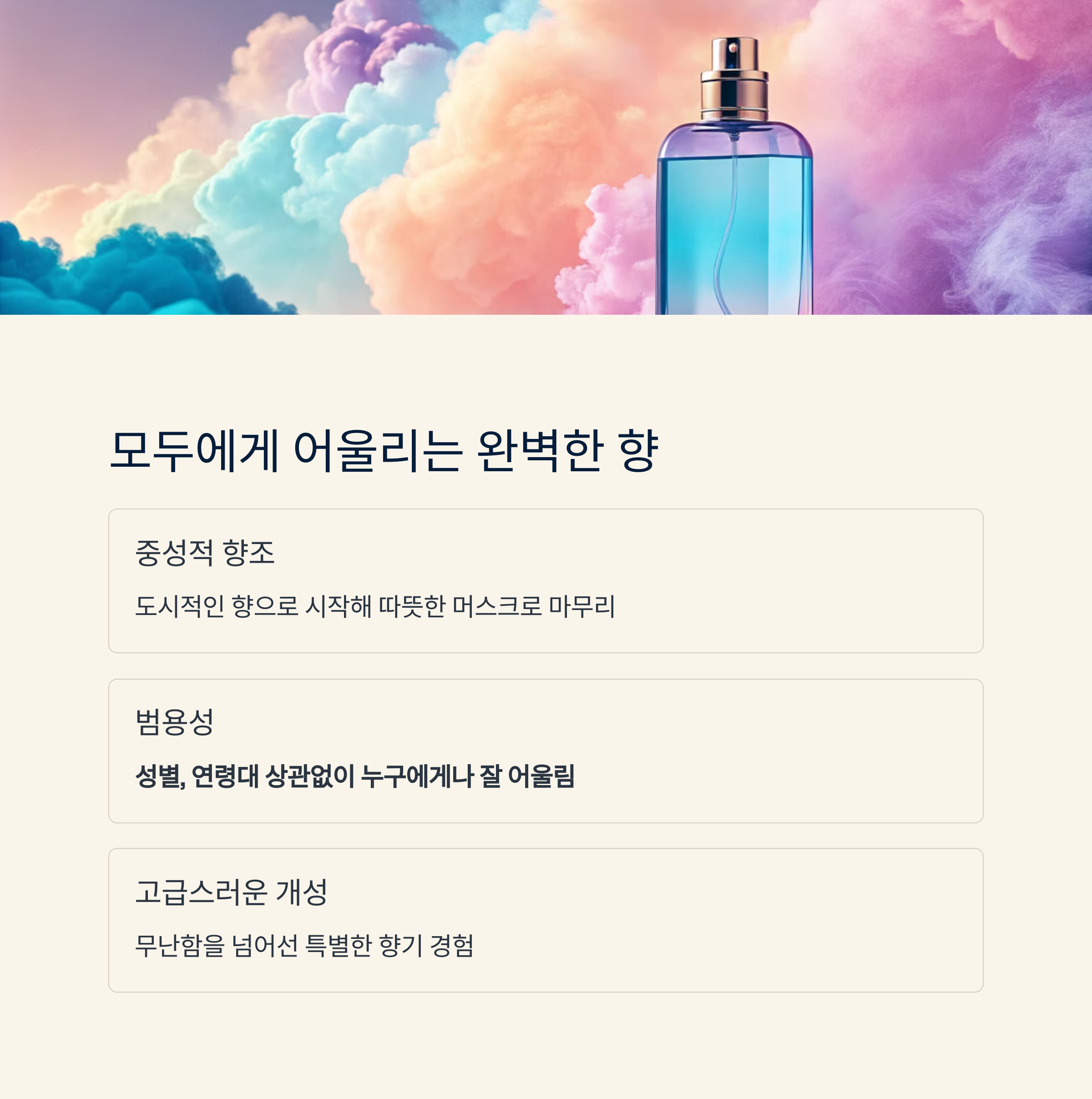 이 조화로운 향의 구조 덕분에 성별, 연령대 상관없이 누구에게나 잘 어울리는 향수입니다.