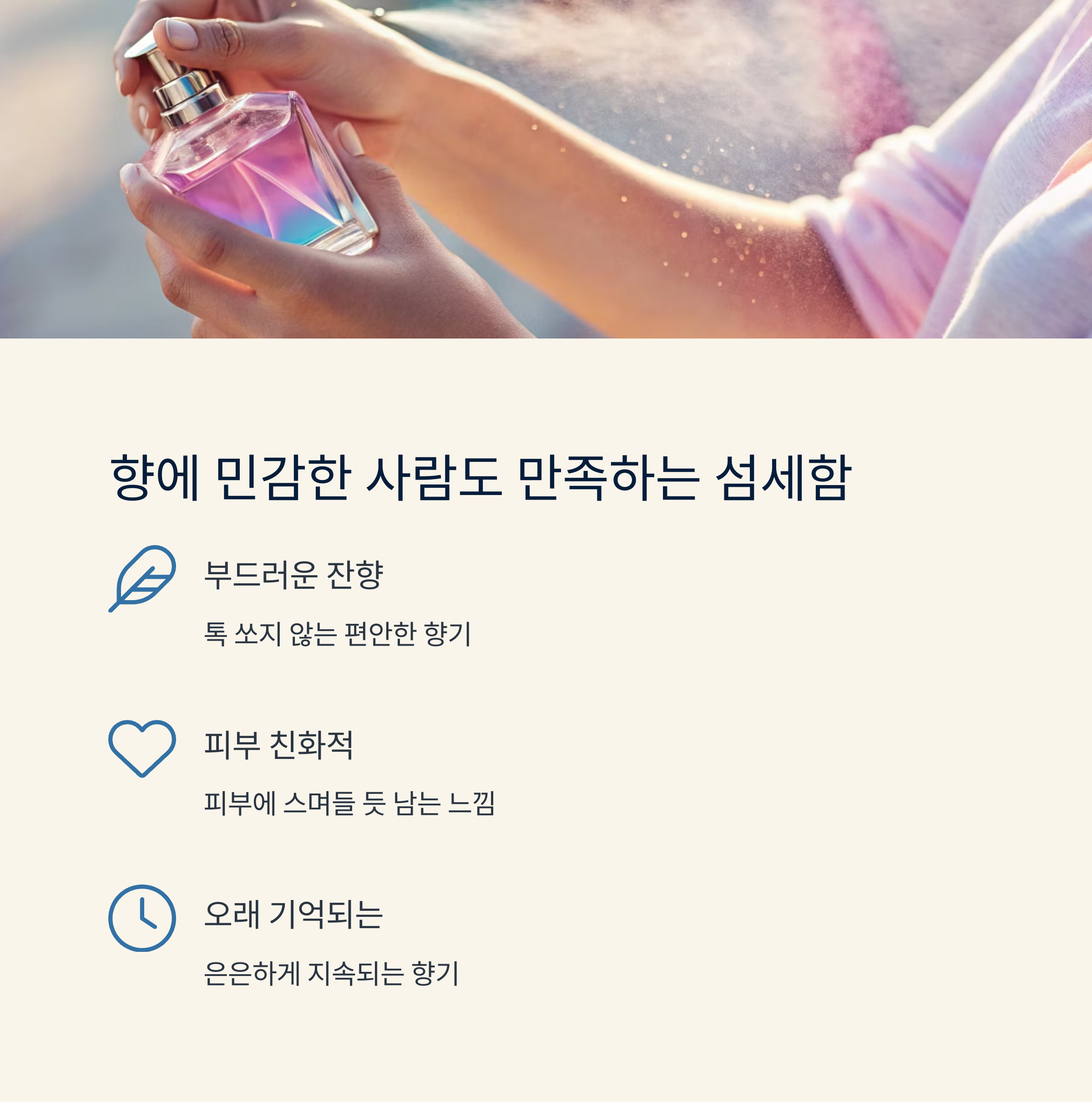 부드럽고 은은한 잔향은 오래 기억되고, 부담 없이 사용할 수 있습니다.