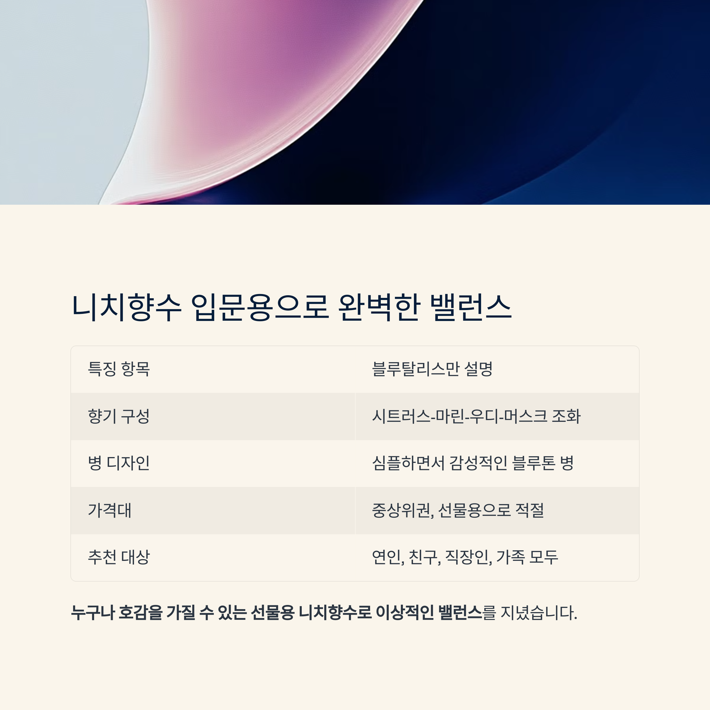 | 연인 생일 선물 | 매우 적합 | 감각적인 잔향과 중성적 향조 |