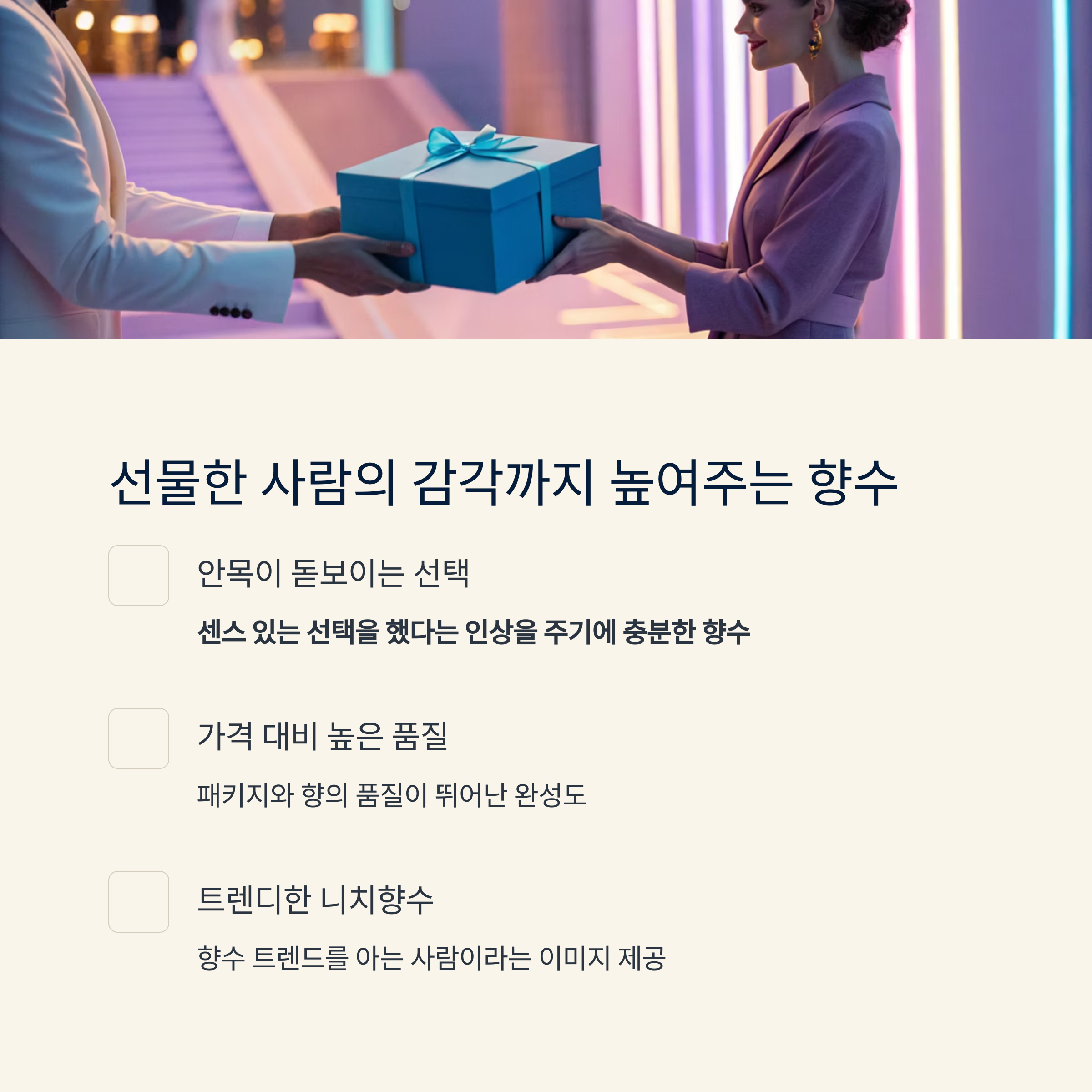 향수 선물은 받는 사람뿐 아니라 주는 사람의 안목도 평가되는 요소입니다.