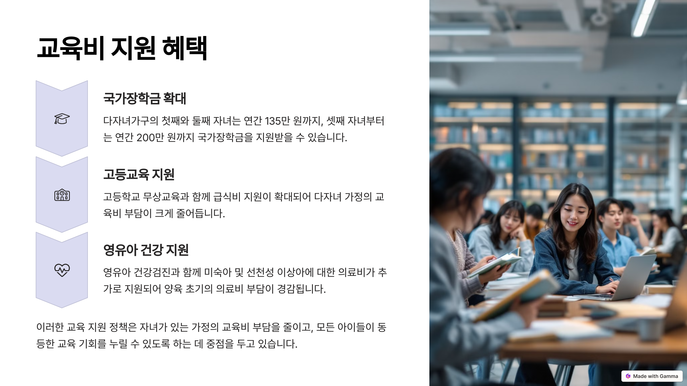 정부는 저출생 문제 대응을 위해 다자녀 기준을 기존 3자녀에서 2자녀로 완화하고, 전방위적인 혜택을 확대하고 있어요. 출산부터 양육, 교육, 생활비, 교통, 에너지까지 다양한 분야에서 실질적인 지원을 받을 수 있어요.
