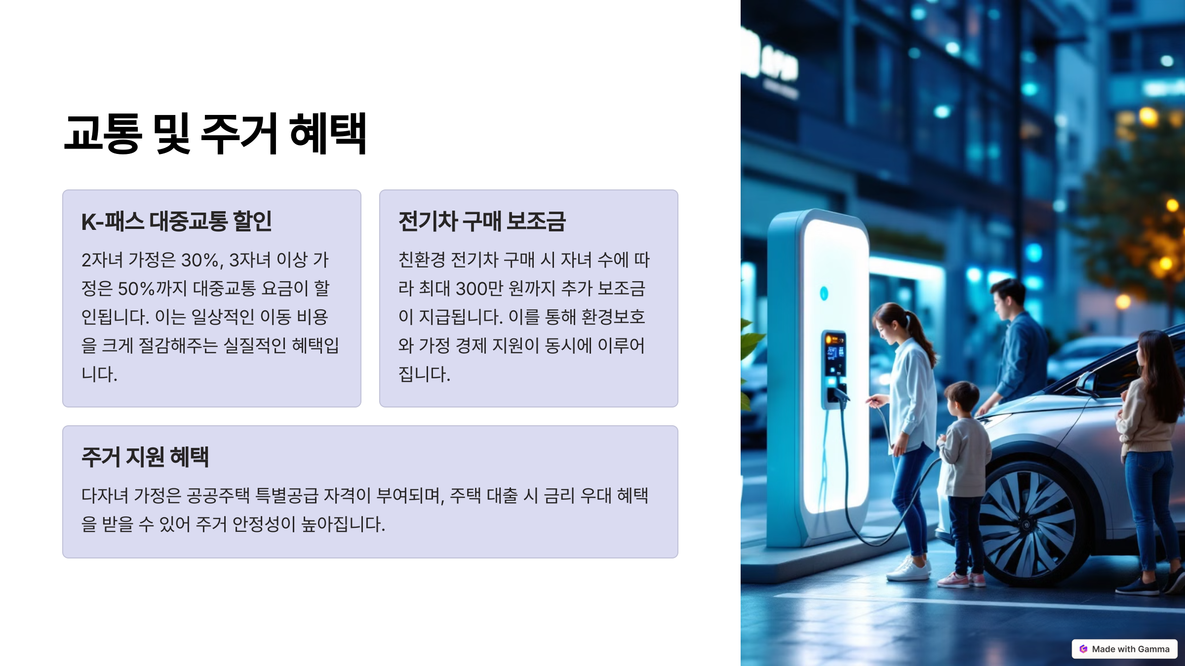 2자녀 가구 30%, 3자녀 이상 50%까지 대중교통 요금 할인 - 전기차 구매 보조금