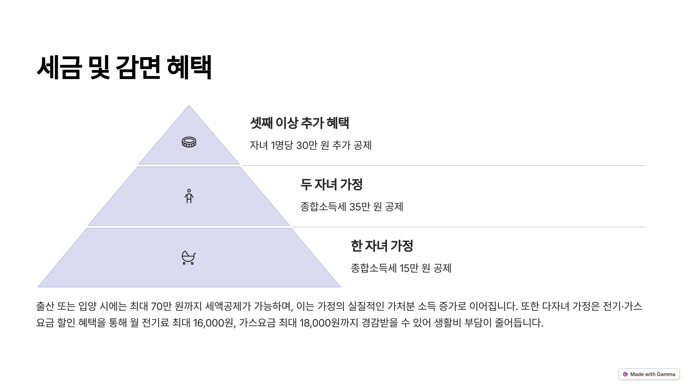 출산과 양육뿐만 아니라 세금, 교통, 교육, 에너지 분야까지 현금 + 감면 + 복지 혜택이 폭넓게 적용돼요.