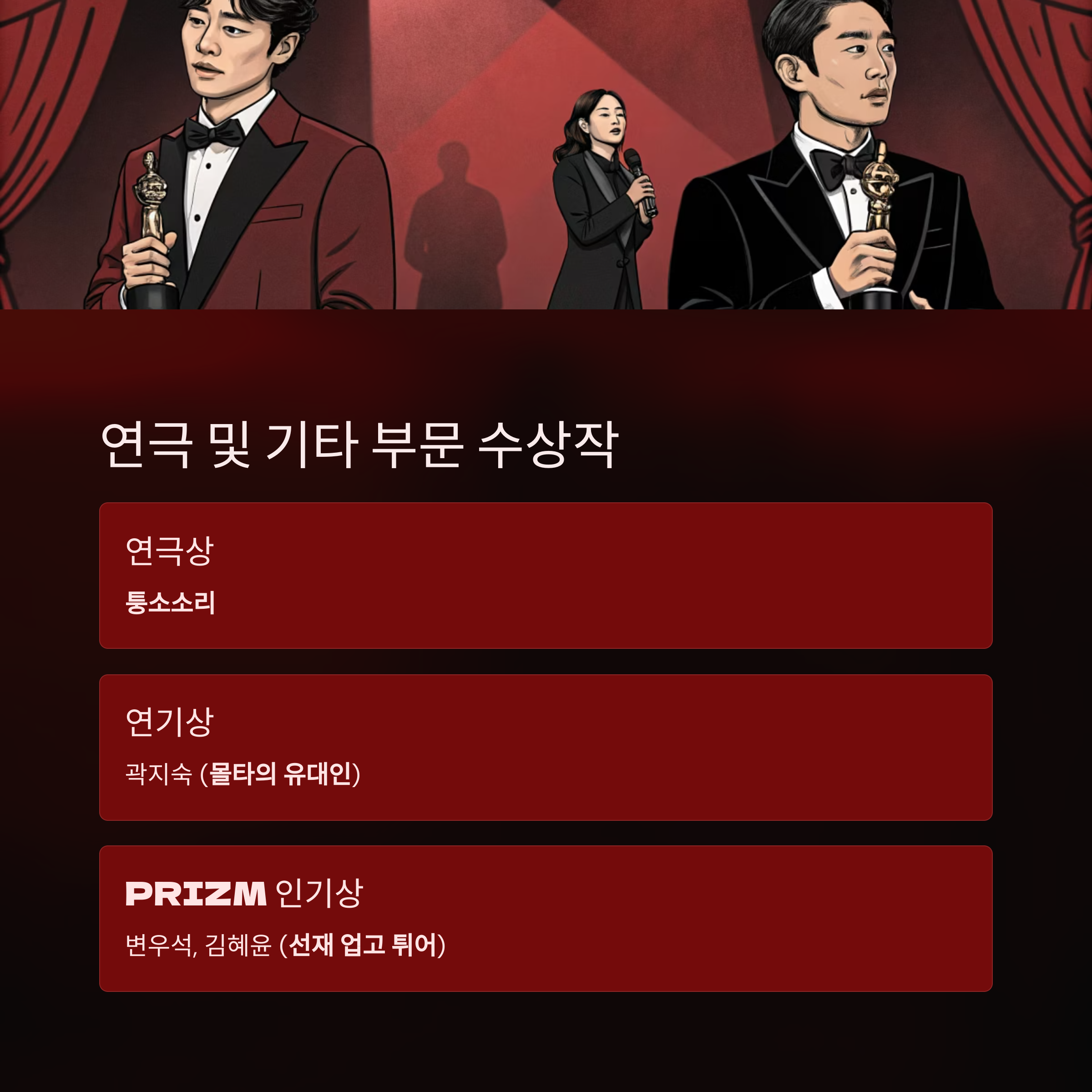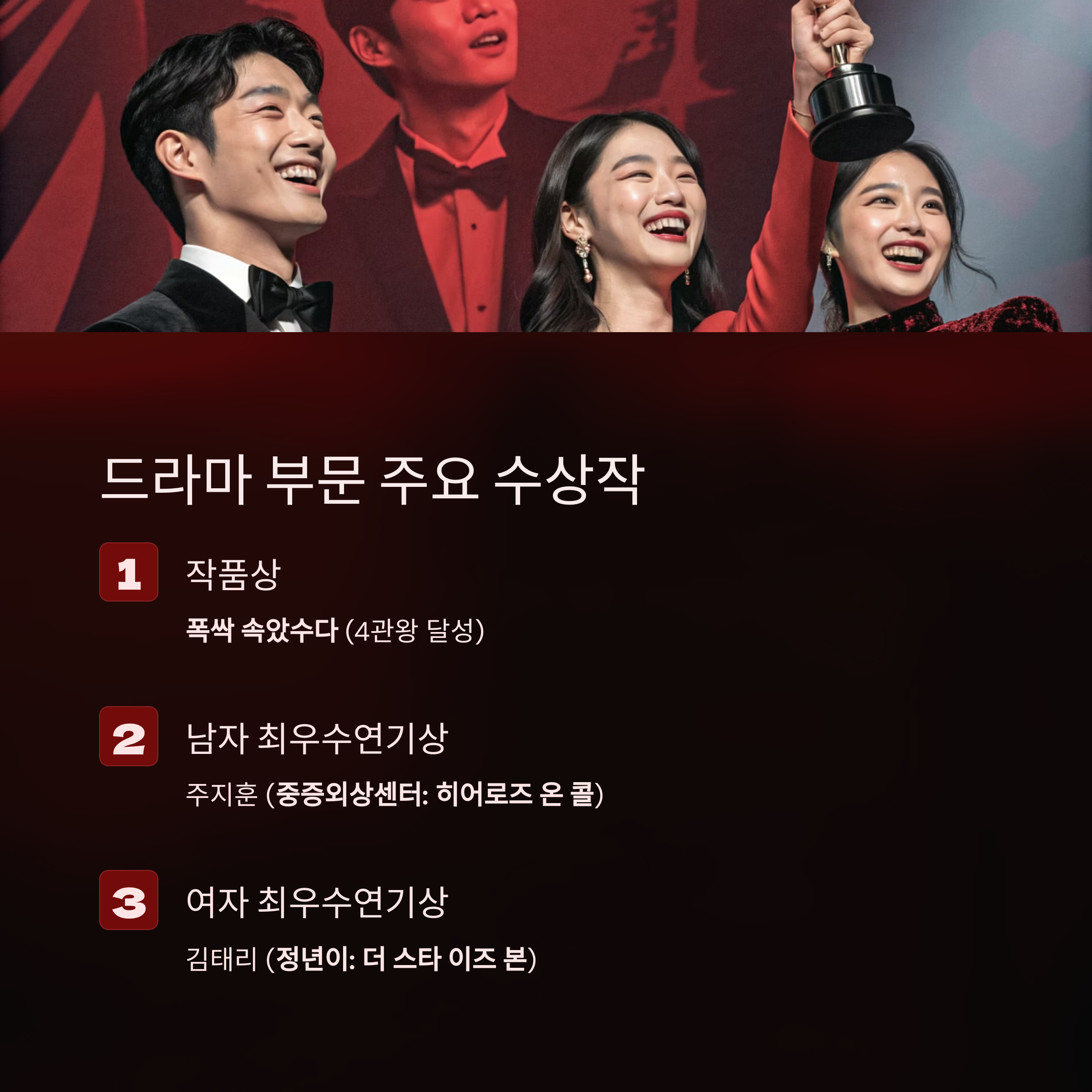- 최다 수상: 넷플릭스 드라마 《폭싹 속았수다》가 드라마 작품상, 극본상, 남녀 조연상 등 4관왕을 차지하며 올해 최다 수상작이 됨.