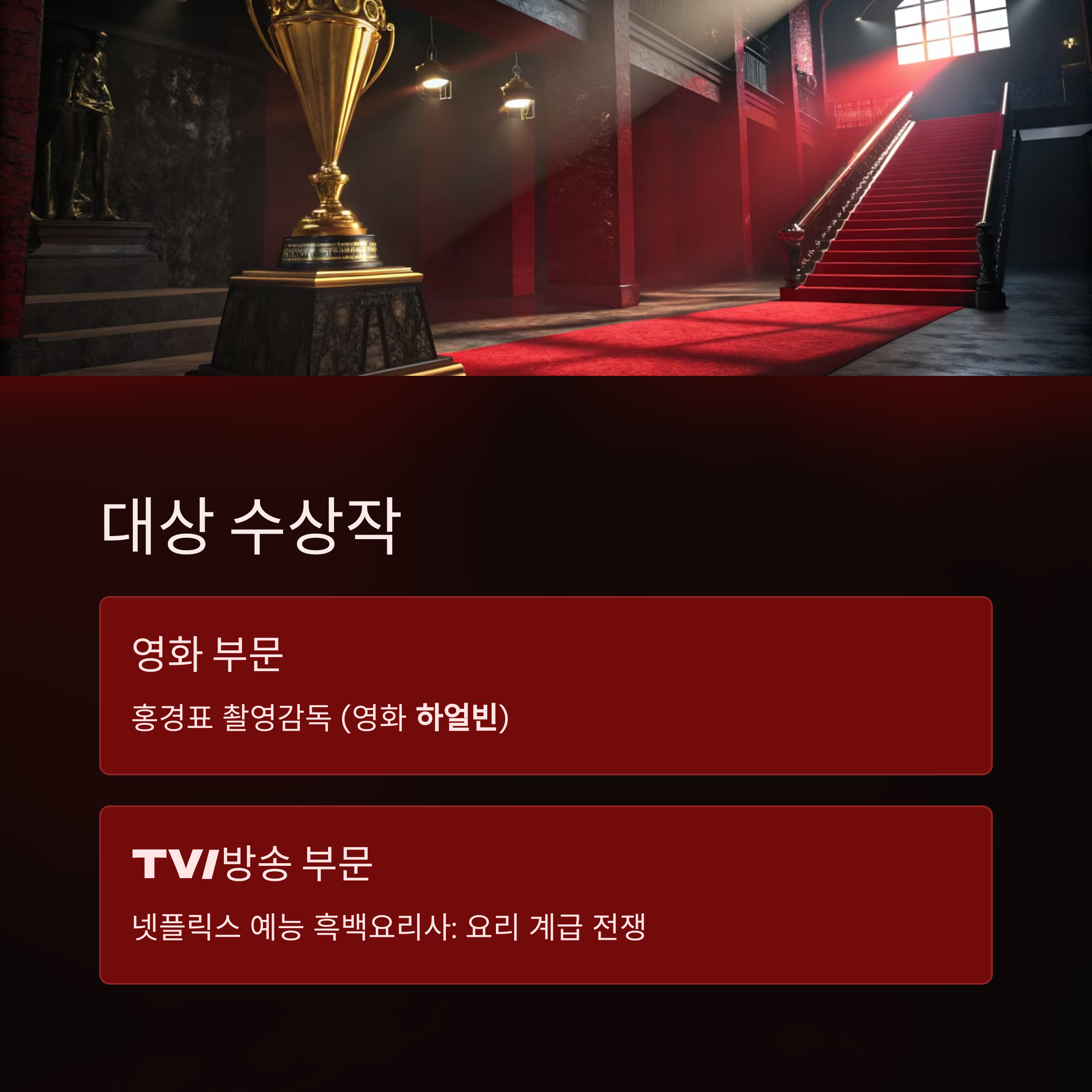 - 영화 부문 2관왕: 《하얼빈》은 작품상과 대상(홍경표 촬영감독)으로 2관왕을 기록.