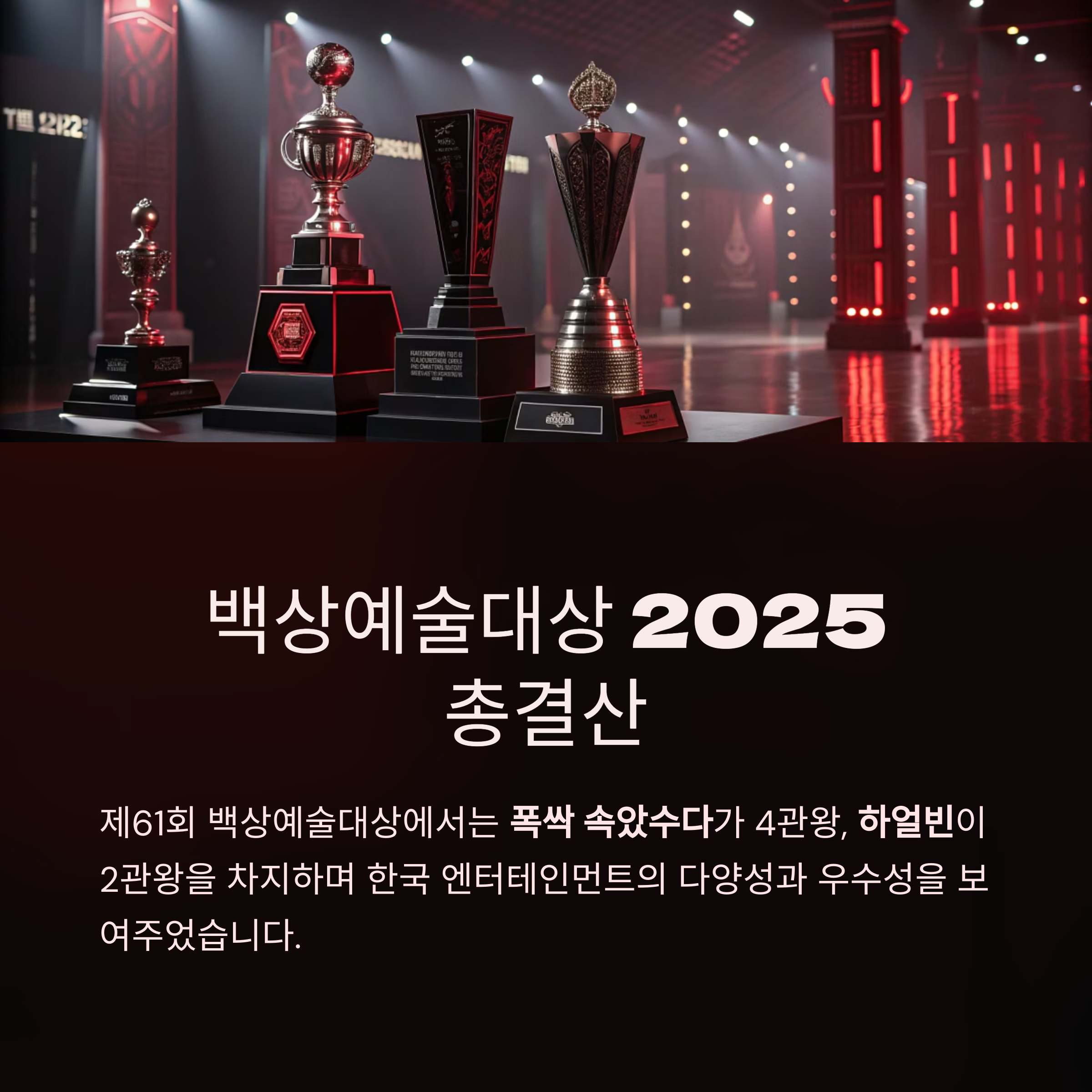 제61회 백상예술대상(2025)의 대상은 영화 《하얼빈》의 홍경표 촬영감독, TV 부문은 넷플릭스 예능 《흑백요리사: 요리 계급 전쟁》이 차지했습니다. 드라마 《폭싹 속았수다》는 작품상, 극본상, 남녀 조연상 등 4관왕을 기록하며 올해 최다 수상작이 됐습니다. 영화 부문 작품상은 《하얼빈》, 감독상은 《리볼버》 오승욱 감독이 차지하는 등, 각 부문별로 다양한 작품과 배우들이 영예를 안았습니다.